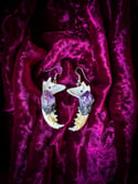 Real Mink jaw bone earring. Crystallized and embellished with amethyst and carborundum. Available in an assortment of colors. Natural bone Jaw with: Red hand dyed Amethyst, Orange, Green, Blue, Natural Amethyst, Dark Purple and Black Amethyst. All earrings have been sealed with a protective resin coating.