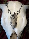 Stainless steel, chainmaille rings were used to attach individually cut, matte black chain to larger metal rings on this piece. The mink skull was painted with a platinum/silver metallic mixed paint and embellished with smokey quartz points and a crushed sand/quartz mixture.