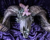 This beautiful ram skull was professionally cleaned, hand painted ombré with a lavender/grey paint, crackle painted and coated with a shimmering, blue/purple, color shifting, Dragonfly glaze. Its embellished with lavender and grey aura quartz crystals points, sparkling rainbow carborundum and finished with a protective resin coating.