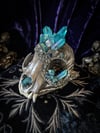This gorgeous bobcat skull was professionally cleaned and hand painted with a silver metallic paint. It's embellished with sparkling pyrite, colorful chalcopyrite, light blue aura quartz crystal points and finished with a protective resin coating. It measures approximately 5" x 4” x 4” and would make a great decoration on an alter, mantle or any display.