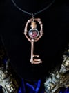 There are currently two keys available in this listing with more miniature glass globe skeleton key necklaces underway. The skeleton keys are made with real coyote foot bone metatarsals and real bobcat toe bones. The rose gold painted keys' glass globe contains tiny pink tourmaline crystal chips while the dragonfly glazed blue/purple metallic shifting skeleton keys' glass globe contains pyrite chips (Fools Gold).