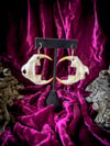 Real muskrat jaw bone earrings, bisected and fastened together to create these very unique fighty moon earrings. They’re also available in metallic dragonfly glazed color shift paint: Green/Purple, Purple/Blue, Purple/Gold. All earrings have been sealed with a protective resin coating.