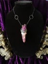 I used stainless steel chainmaille rings to attach individually cut matte black, Victorian chain to larger metal O rings on this piece. The duck stained and embellished with Carborundum and hand dyed Quartz crystals.