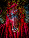 This beautiful coyote skull was hand painted with crimson red paint and finished with a black crackle effect paint. It was embellished with black tourmaline and red quartz crystal points and finished with a protective resin coating.