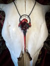 Stainless steel, black, chain maille rings were used to attach matte black chain to a larger metal ring which was fused to the back of the embellished bone. The deer vertebra was stained and accented with a darker paint, embellished with black tourmaline and deep red quartz points.