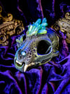 A genuine encrusted bobcat skull, professionally cleaned, hand painted with green & black crackle effect paint, embellished with green aura