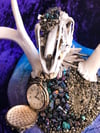 The base was crackled and painted with blue and purple paint while the antler is painted white. The rabbit skull was embellished with clear quartz, pyrite and vibrantly colorful, chalcopyrite crystals. A pocket watch is secured to the base.
